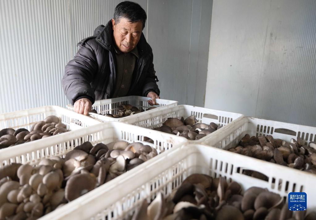 2月15日,河北省唐山市豐南區東田莊鄉大吳莊村的農民在庫房碼放剛采摘的平菇。