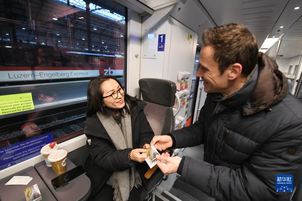 2月14日,在瑞士盧塞恩開(kāi)往因特拉肯地區的金色山口列車(chē)上,瑞士中部鐵路公司工作人員(右)為中國游客發(fā)巧克力。