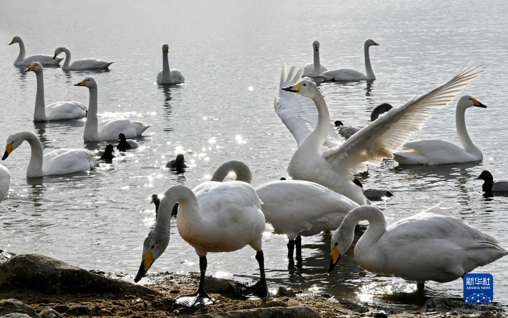 大天鵝在榮成市崖頭街道櫻花湖一食物投放點(diǎn)游弋、覓食(2月15日攝)。