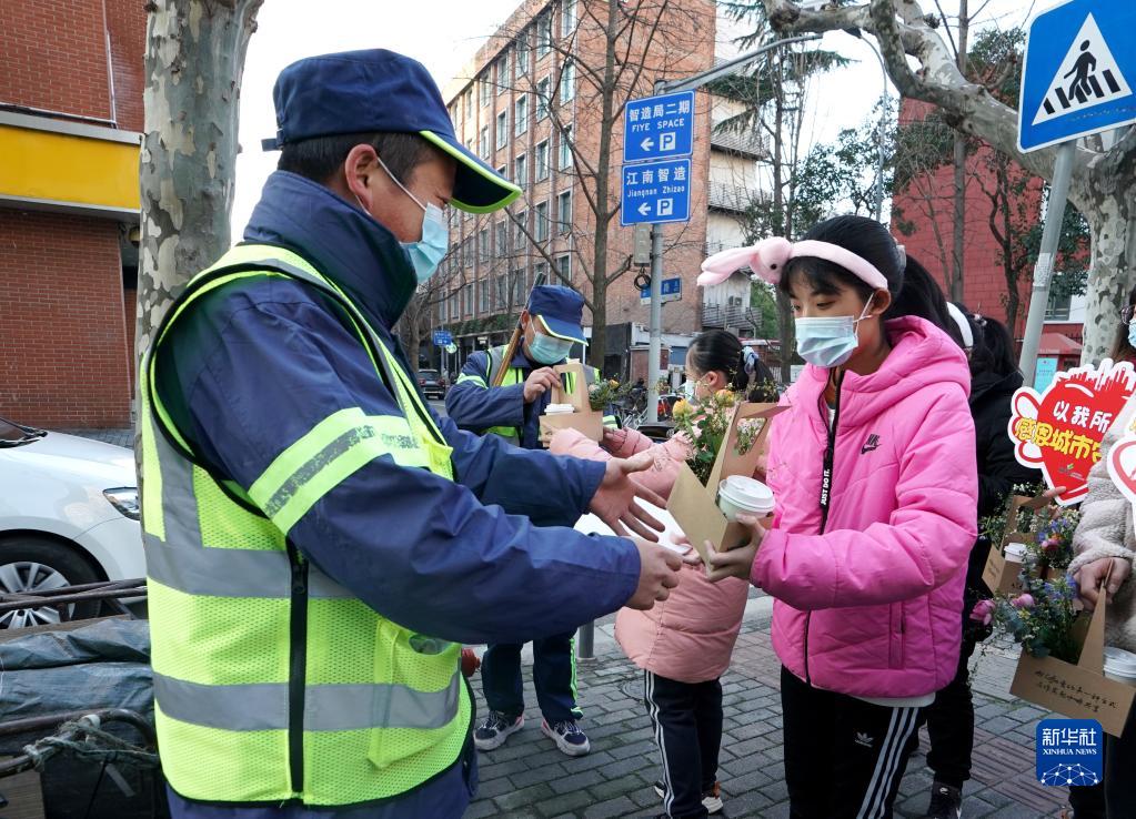 2月15日,黃浦區特殊教育職業(yè)學(xué)校的學(xué)生們將咖啡與花贈送給環(huán)衛工人。