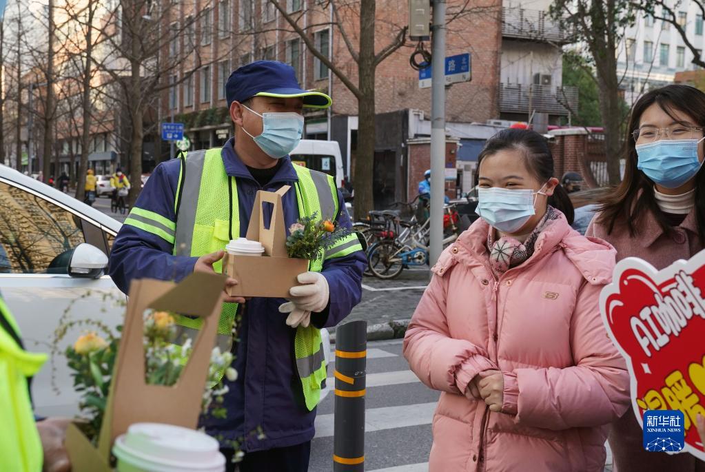 2月15日,收到咖啡和花的環(huán)衛工人與黃浦區特殊教育職業(yè)學(xué)校的師生交流。
