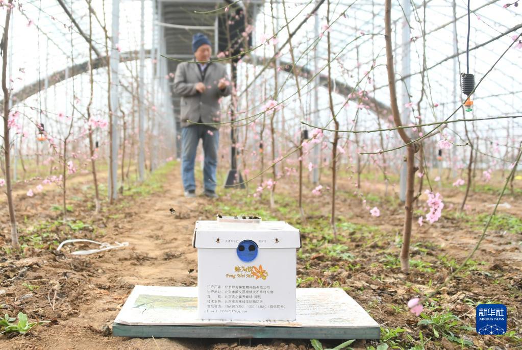 2月15日在北京市峪口鎮西營(yíng)村“未來(lái)果園”大桃育苗示范基地拍攝的近期放置在這里的授粉熊蜂蜂箱。