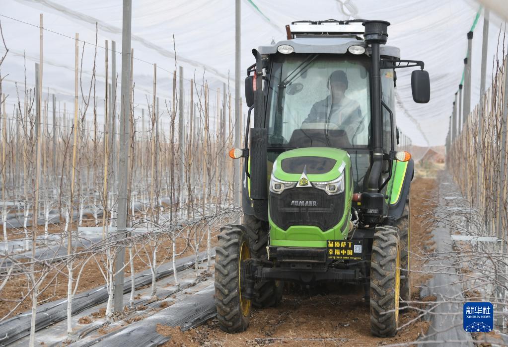 2月15日,工作人員在北京市峪口鎮西樊各莊村京瓦果業(yè)科技示范園駕駛農機設備耕地。