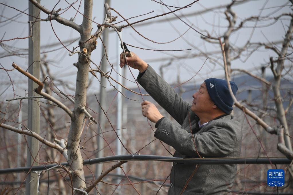 2月15日,果農在北京市峪口鎮西營(yíng)村“未來(lái)果園”剪枝。