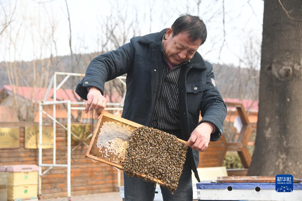 2月15日,在北京市峪口鎮的蜜蜂養殖基地,工作人員查看蜜蜂生長(cháng)情況。