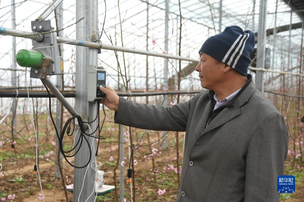 2月15日,在北京市峪口鎮西營(yíng)村“未來(lái)果園”大桃育苗示范基地,果農查看自動(dòng)通風(fēng)設備的運行情況。
