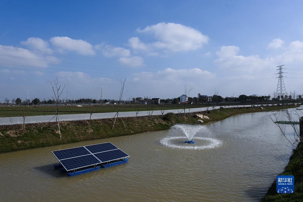 這是在浙江省嘉興市南湖區鳳橋鎮星火村的一個(gè)綠色農田建設項目現場(chǎng)拍攝的依托太陽(yáng)能運行的稻田退水零直排設施(2月15日攝)。