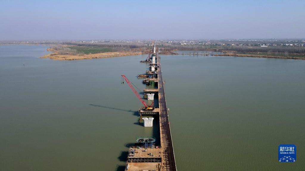 這是2月15日拍攝的合新鐵路安徽段懷洪新河特大橋跨沱湖水中墩施工現場(chǎng)(無(wú)人機照片)。