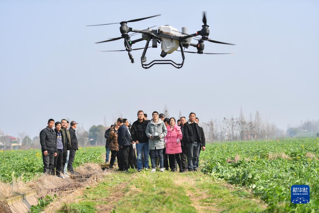 2月15日,在沅江市共華鎮福安村,學(xué)員們在農業(yè)植保無(wú)人機操作員培訓班上觀(guān)看無(wú)人機起飛演示。