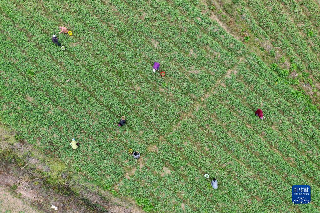 2月15日,在龍里縣灣灘河鎮郊外,菜農在采摘豌豆尖(無(wú)人機照片)。