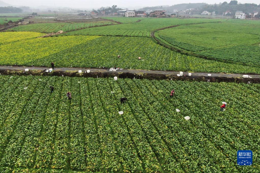 2月15日,在湖南省資興市回龍山瑤族鄉柏樹(shù)村蔬菜種植基地,農民在采收菜心(無(wú)人機照片)。