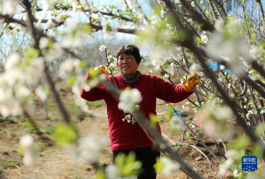 2月15日,山東省臨沂市沂南縣銅井鎮三社莊村的果農在大棚里為櫻桃花人工授粉。