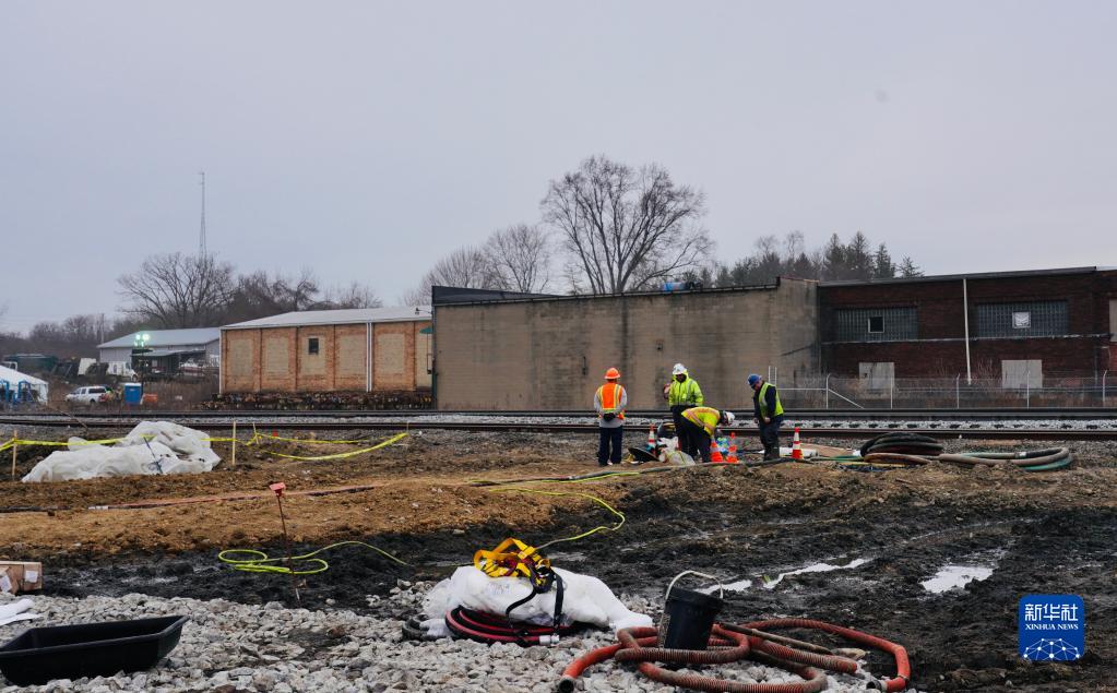2月14日,在美國俄亥俄州東巴勒斯坦鎮,工作人員在事故現場(chǎng)附近處理污水。