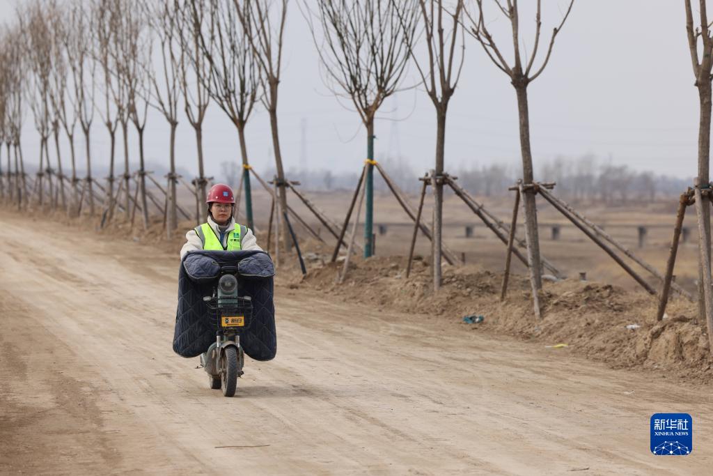 楊鑫博騎行前往雄安唐河河谷郊野公園項目現場(chǎng)(2月15日攝)。