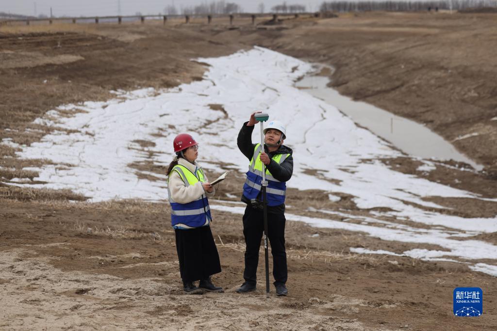 楊鑫博(左)和同事在雄安唐河河谷郊野公園項目現場(chǎng)勘測(2月15日攝)。