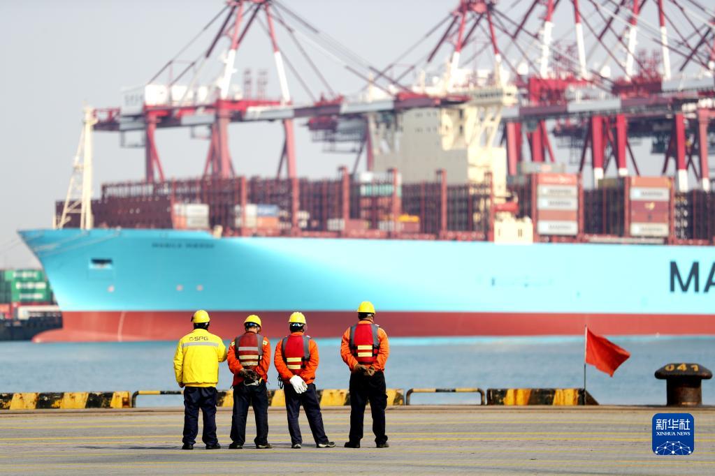 2月16日,在山東港口青島港,工人在迎接一艘貨輪靠泊。