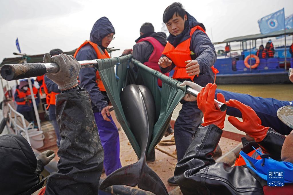 在江西鄱陽(yáng)湖松門(mén)山水域的灘涂上,工作人員將剛剛捕撈的江豚運至船上進(jìn)行體檢(2月14日攝)。