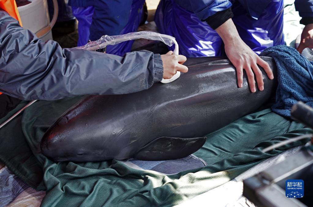 在江西鄱陽(yáng)湖松門(mén)山水域,科研人員在船上為江豚進(jìn)行體檢(2月15日攝)。