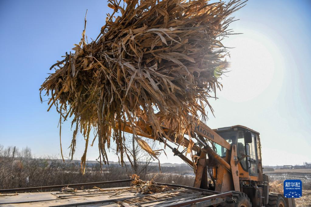 2月16日,在吉林省長(cháng)春市九臺區東湖街道腰站村,隆達興養殖農民專(zhuān)業(yè)合作社農民操作農機將玉米秸稈裝車(chē)。