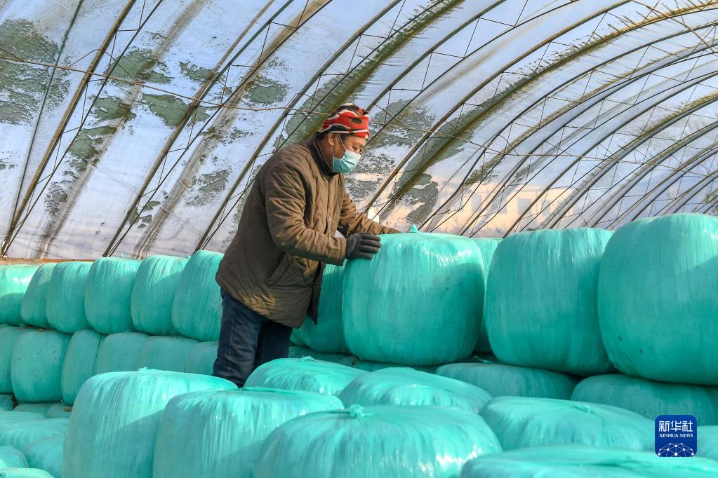 2月16日,在吉林省長(cháng)春市九臺區東湖街道腰站村,隆達興養殖農民專(zhuān)業(yè)合作社農民整理玉米秸稈壓縮包。