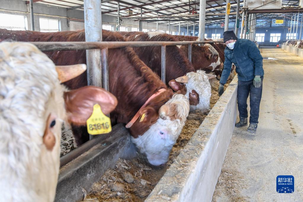 2月16日,在吉林省長(cháng)春市九臺區東湖街道腰站村,隆達興養殖農民專(zhuān)業(yè)合作社農民給肉牛投喂玉米秸稈飼料。