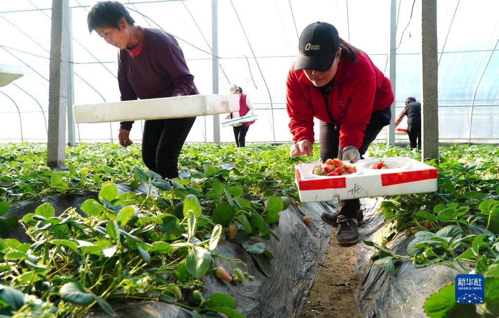 2月16日,在山東省東平縣無(wú)鹽村的草莓種植大棚,村民在采摘草莓。