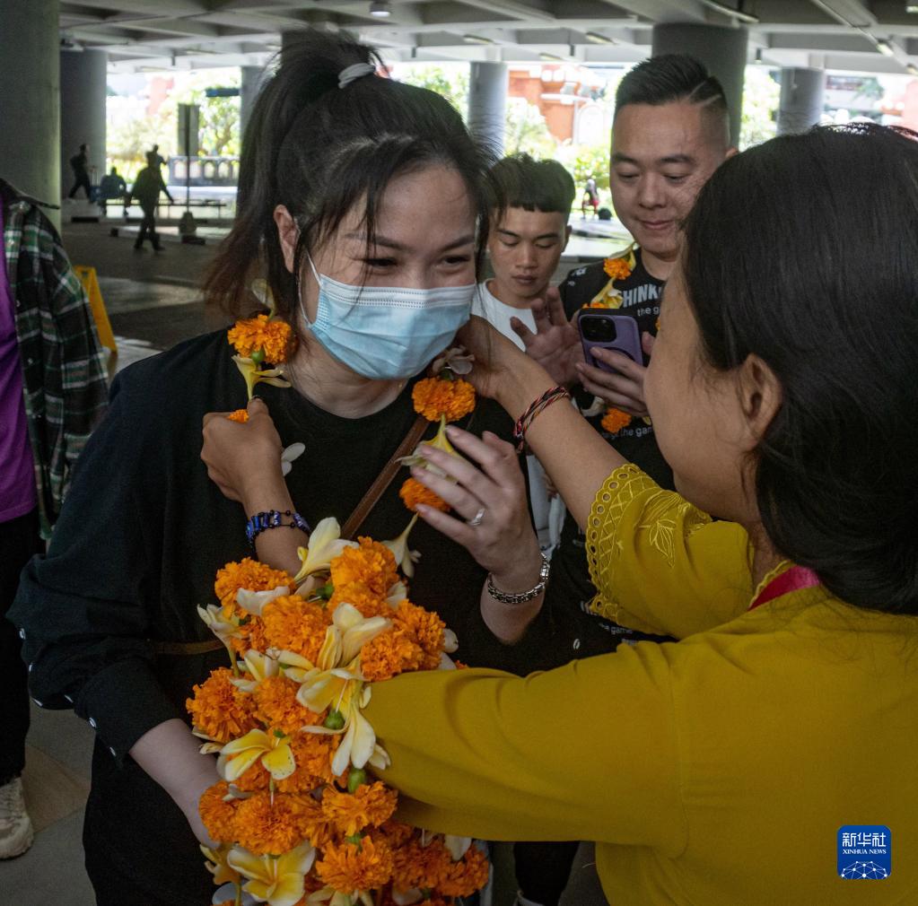 2月12日,在印度尼西亞巴厘島伍拉萊國際機場(chǎng),工作人員為中國游客佩戴歡迎花環(huán)。