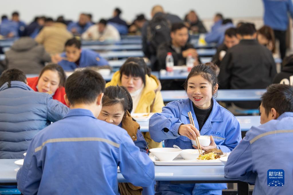 2月16日中午,岑福珍(右二)在午餐時(shí)與工友聊天。
