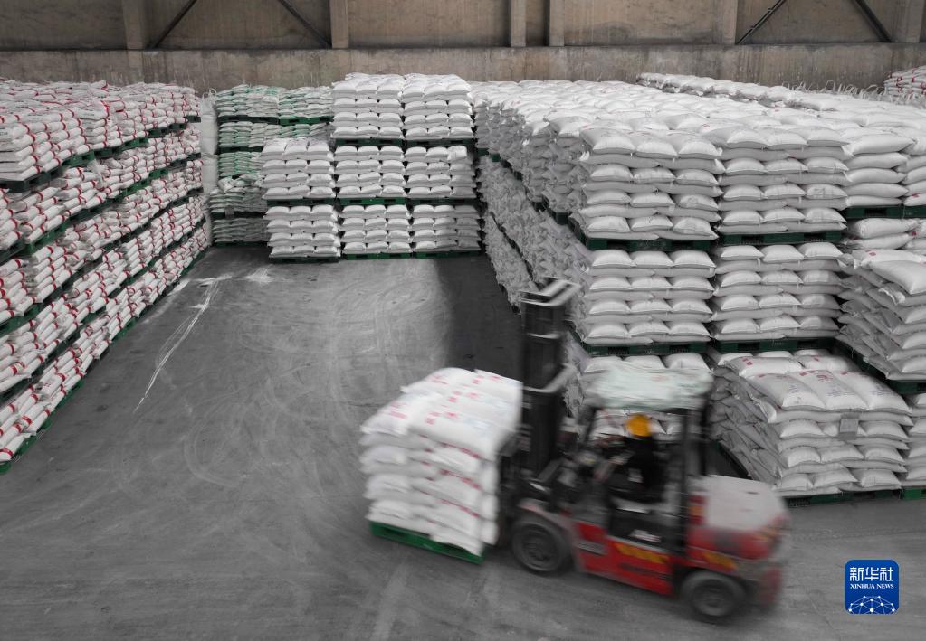 2月16日,在貴州省貴陽(yáng)市開(kāi)陽(yáng)縣一家化肥生產(chǎn)企業(yè),工人駕駛叉車(chē)轉運準備外銷(xiāo)的化肥(無(wú)人機照片)。