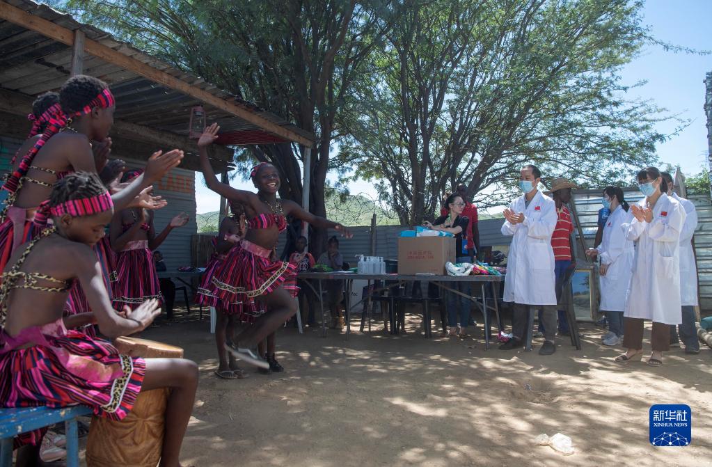 2月16日,在納米比亞首都溫得和克哈瓦那非正式定居點(diǎn)的弗蘭斯藝術(shù)培訓中心,同學(xué)們用傳統舞蹈感謝中國醫生。