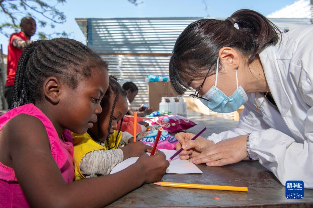 2月16日,在納米比亞首都溫得和克哈瓦那非正式定居點(diǎn)的弗蘭斯藝術(shù)培訓中心,孩童們用中國醫生送的繪畫(huà)工具畫(huà)畫(huà)。