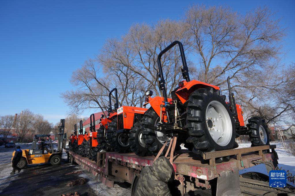 2月16日,佳木斯驥馳拖拉機制造有限公司大院,叉車(chē)向運輸車(chē)上運送拖拉機。