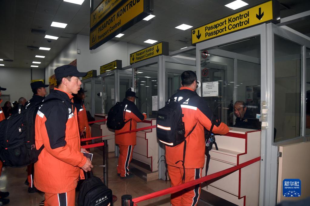 2月16日,中國救援隊隊員在土耳其阿達納國際機場(chǎng)辦理乘機手續。