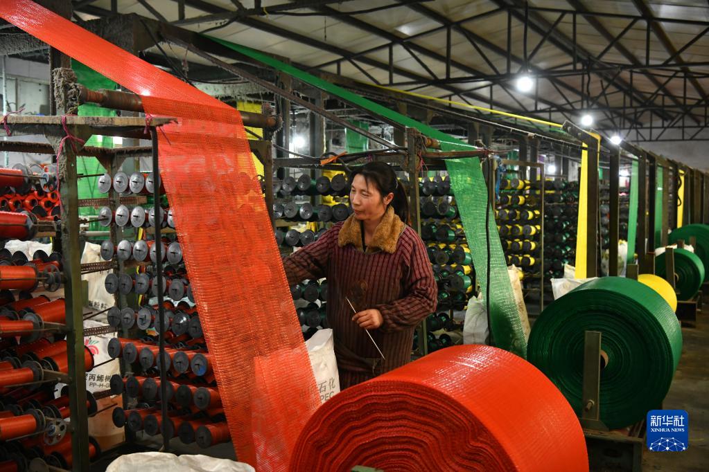 2月16日,地處獻縣泛區的河北省滄州市獻縣小平王鄉元昌樓村村民在村內一家編織袋加工廠(chǎng)內工作。