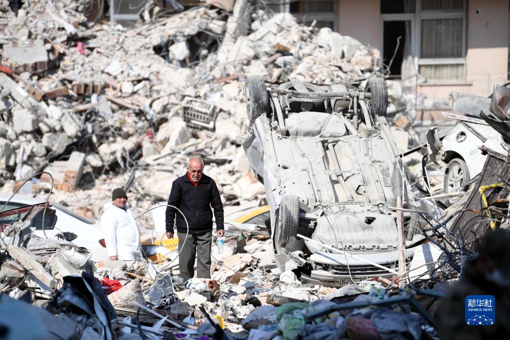 2月11日,一名男子從土耳其哈塔伊省安塔基亞市一處受損建筑物廢墟中走過(guò)。