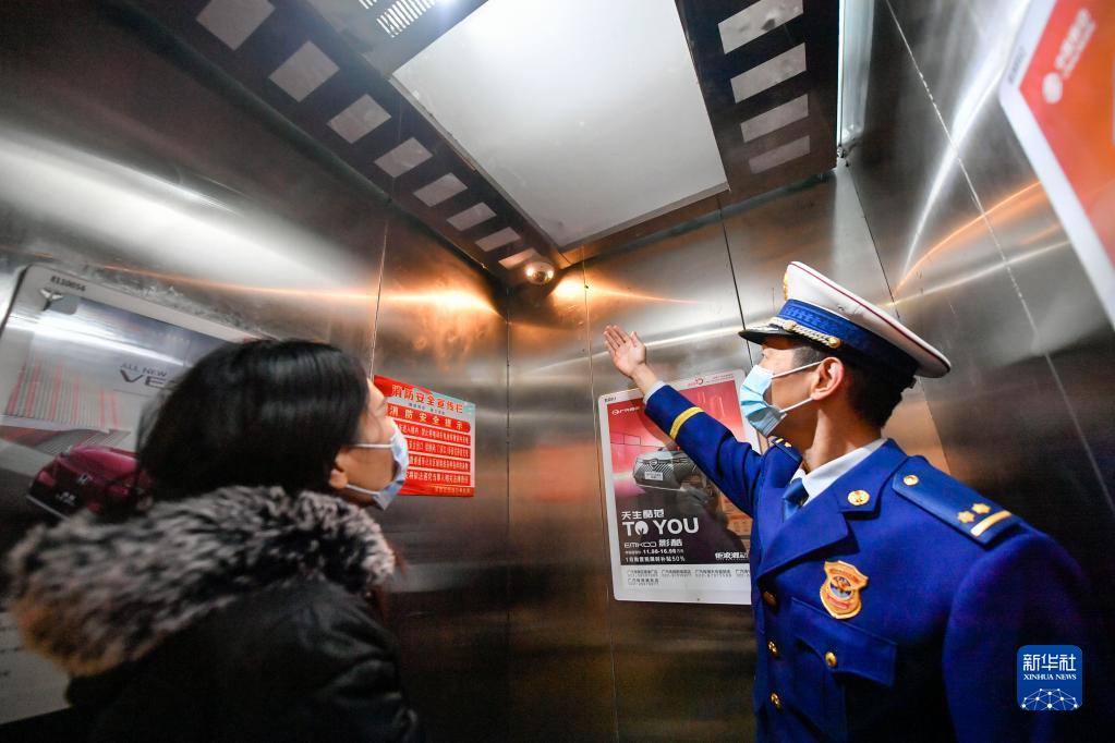 2月16日,天津市東麗區消防救援支隊工作人員在張貴莊街道華亭里社區躍麗家園小區為居民講解智能梯控系統。