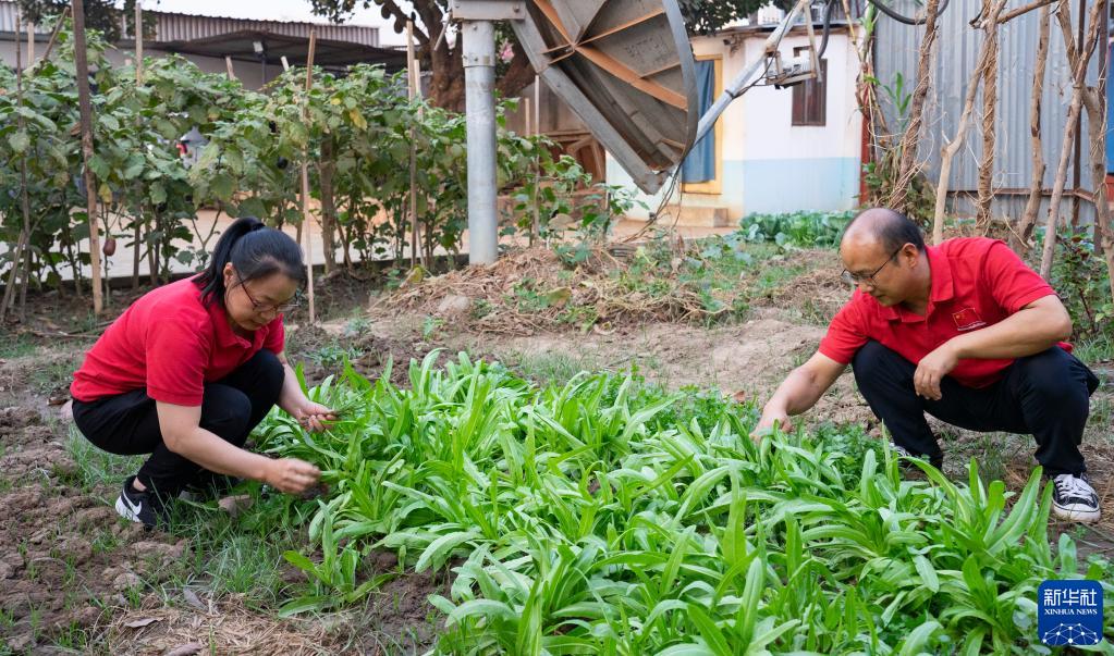 2月14日,在中非共和國首都班吉,第19批援中非中國醫療隊婦科醫生張麗霞(左)和麻醉醫生張才軍在駐地菜地里拔草。