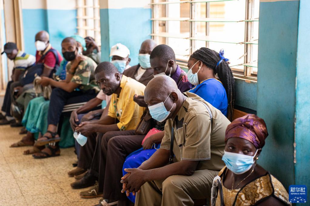 2月13日,人們在中非共和國首都班吉友誼醫院等待中國醫療隊醫生診療。