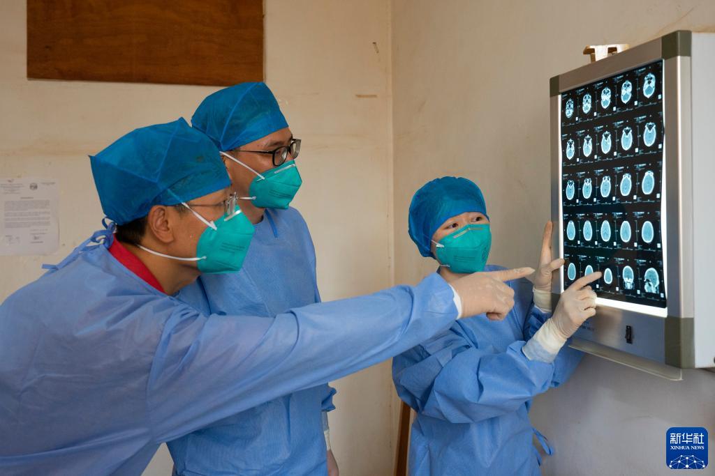 2月14日,在中非共和國首都班吉友誼醫院,第19批援中非中國醫療隊隊長(cháng)、神經(jīng)內科醫生王寶祥(左)與外科醫生徐言(中)、放射科醫生王佳開(kāi)展多學(xué)科會(huì )診。