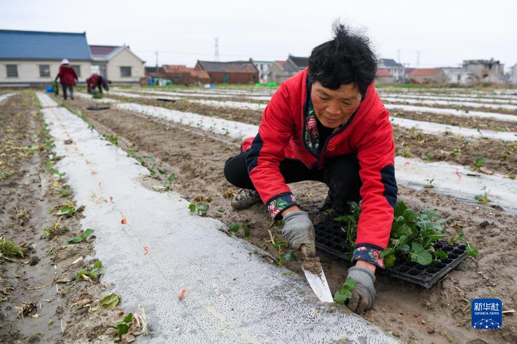 2月17日,農民在江蘇省南通市如東縣大豫鎮一處農田移栽西蘭花幼苗。