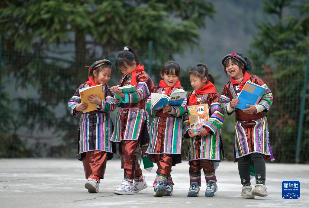 2月16日,在貴州省從江縣西山鎮中寨教學(xué)點(diǎn),領(lǐng)到新書(shū)的瑤族學(xué)生在一起交流。