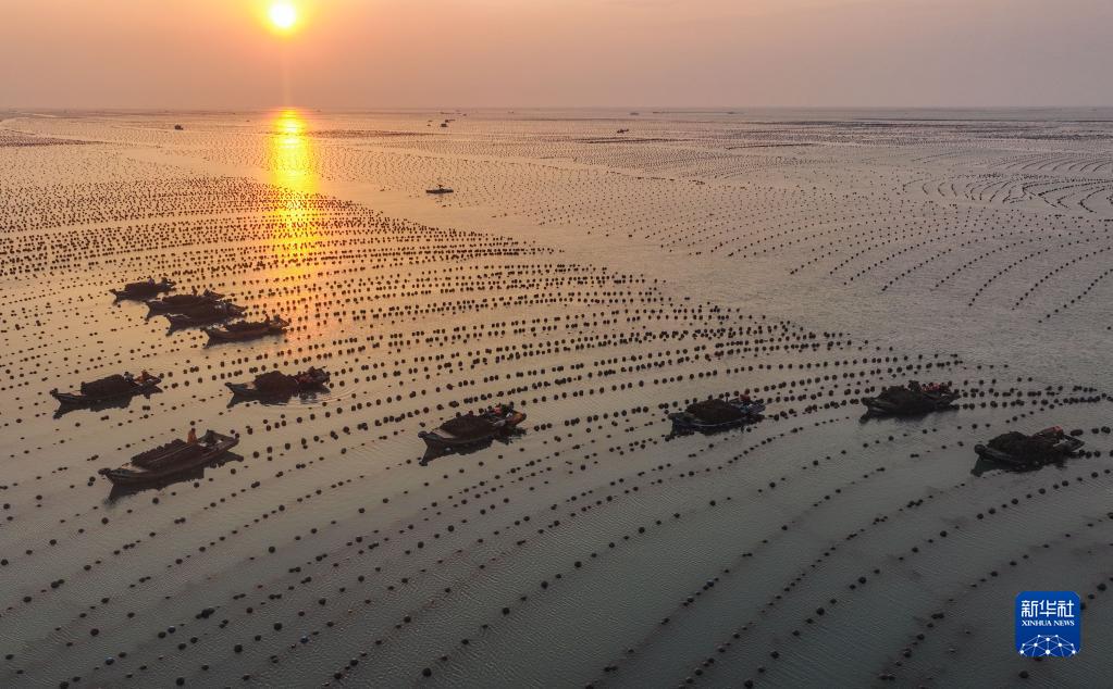 2月17日,在山東省榮成市俚島鎮俚島灣海域牡蠣養殖區,產(chǎn)業(yè)工人們駕駛漁船收獲牡蠣(無(wú)人機照片)。