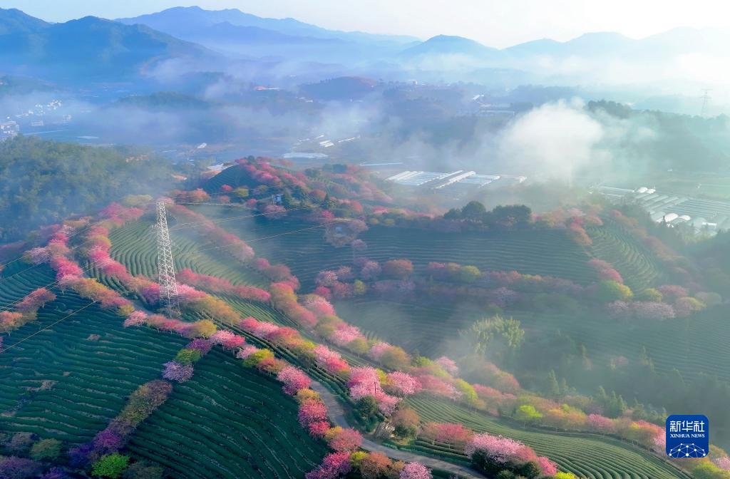 位于漳平市永福鎮的臺品櫻花茶園里云霧繚繞,櫻花盛開(kāi)(2月17日攝 ,無(wú)人機照片)。
