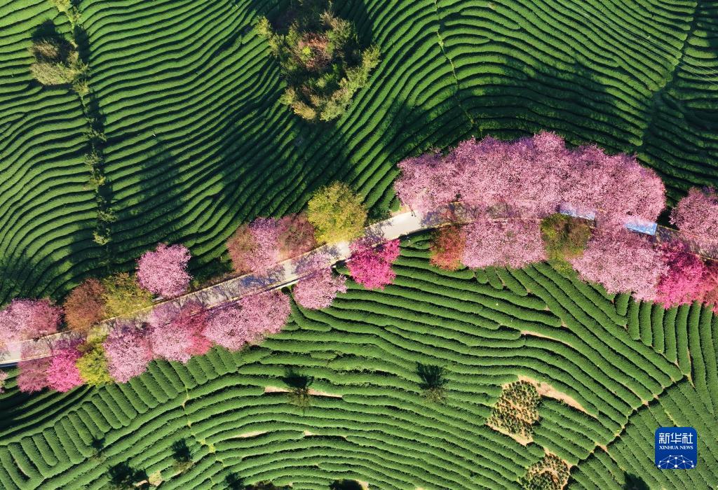 位于漳平市永福鎮的臺品櫻花茶園里櫻花盛開(kāi)(2月17日攝,無(wú)人機照片)。