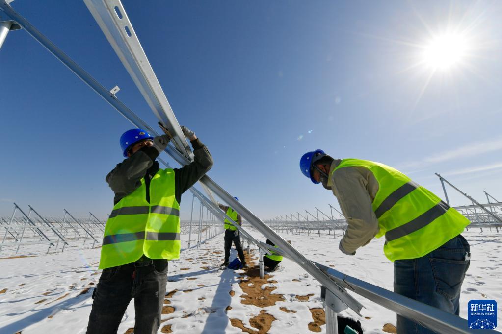 2月16日,在古浪縣黃花灘一處光伏發(fā)電項目建設現場(chǎng),工人安裝光伏支架。