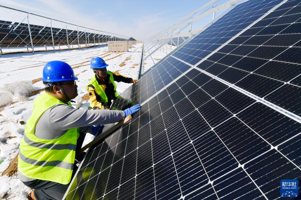 2月16日,在古浪縣黃花灘一處光伏發(fā)電項目建設現場(chǎng),工人安裝光伏組件。