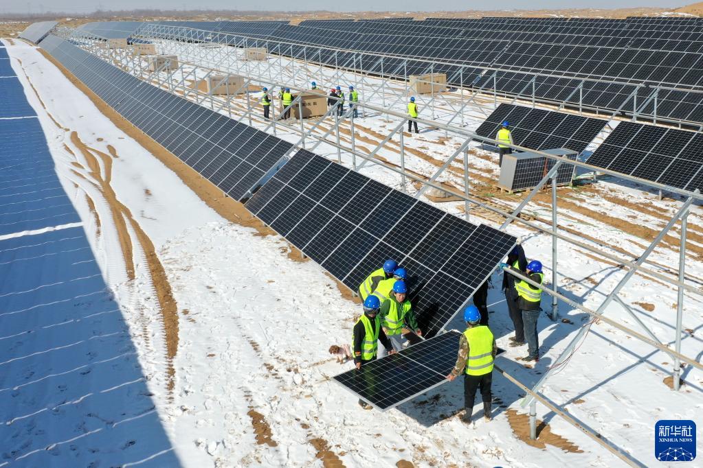 2月16日,在古浪縣黃花灘一處光伏發(fā)電項目建設現場(chǎng),工人安裝光伏組件(無(wú)人機照片)。