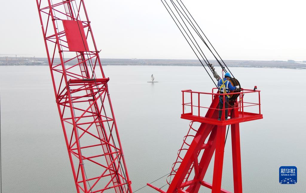 2月17日,在位于中國(上海)自由貿易試驗區臨港新片區的中建二局臨港西島中銀金融中心項目工地,一名智能造樓機動(dòng)力臂駕駛員在進(jìn)行鋼纜安全例行檢查(無(wú)人機照片)。