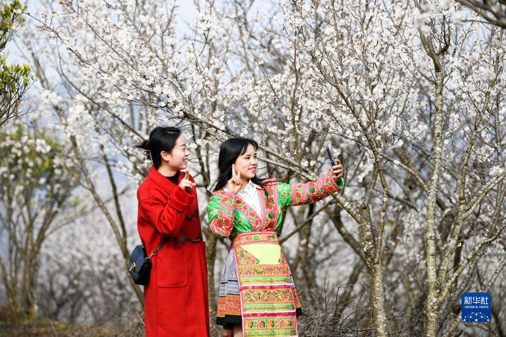 2月17日,在貴州省黔西南布依族苗族自治州安龍縣普坪鎮一處櫻桃基地,游人在盛開(kāi)的櫻桃花下自拍。