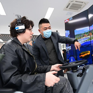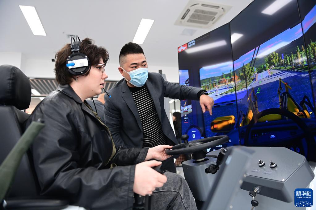 2月17日,在西鐵教育培訓基地,西安交通大學(xué)的波蘭留學(xué)生寶娜(前)在貨裝實(shí)訓室體驗模擬駕駛。